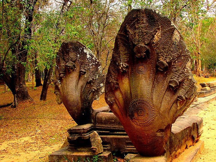 galleries around a central sanctuary, collapsed at present. The enclosures are tied with "cruciform cloisters", like Angkor Wat. Structures known as libraries lie to the right and left of the avenue that leads in from the east. There is extensive carving of scenes from Hindu mythology, including the Churning of the Sea of Milk and Vishnu being borne by the bird god Garuda. Causeways have long balustrades formed by bodies of the seven-headed Naga serpent.